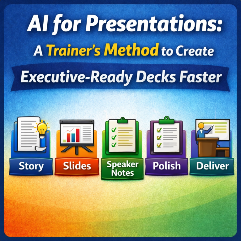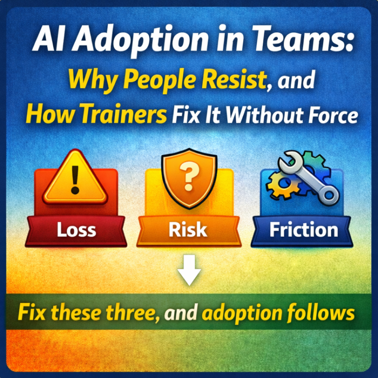 AI adoption fails when we teach tools like tutorials. This post explains five andragogy-based shifts—prompt ownership, experience-driven inputs, pressure-moment learning, use-case-first design, and credibility protocols—that drive real AI-enabled productivity in managers and teams.